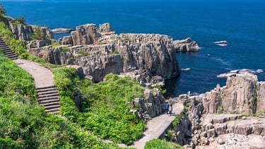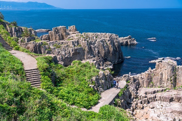 Tojinbo is a famous coastal scenic spot in Sakai City, Fukui Prefecture. The area is made of pyroxene andesite formed by volcanic activity, and its unique topography has been created by erosion and weathering by waves over a long period of time. Tojinbo is designated as a natural monument of Japan and is one of the most popular tourist destinations in Fukui Prefecture.