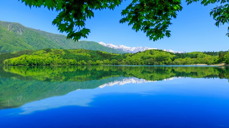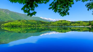 The three lakes of Nishina (Lake Aoki, Lake Nakatsuna, and Lake Kisaki), which straddle Omachi City and Hakuba Village in Nagano Prefecture, Japan, are beautiful scenic spots located at the foot of the Northern Alps. These lakes are also known as the “Matsushima of Shinshu,” and their clear waters and surrounding mountains attract many visitors. Lake Aoki is also home to the “Dragon God Legend,” in which it is said that a dragon god lives at the bottom of the lake.