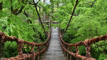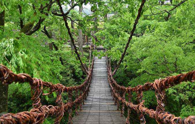 The Kazura Bridge, which spans the tree-lined Ashiba River valley, is a nationally unique suspension bridge of kazura that is 44 meters long, 1.8 meters wide, and 12 meters high. The unique swaying of the bridge is very thrilling. It is said that if you pledge your love on this bridge, you will be happy forever.