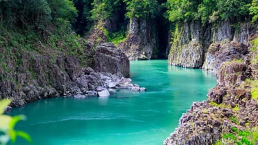 Dorokyo is a gorge along the Kumano River located on the border of Nara, Wakayama, and Mie prefectures. Its magnificent natural scenery has earned it the nickname "Japan's hidden gem." It has been designated a national scenic spot and natural monument, and was registered as a UNESCO World Heritage Site in 2004 as part of the "Sacred Sites and Pilgrimage Routes of the Kii Peninsula." The beauty of the gorge, lined with oddly shaped rocks and cliffs, the clear flowing river, and the lush greenery of the surrounding area all combine to create a beautiful landscape that leaves a deep impression on visitors.