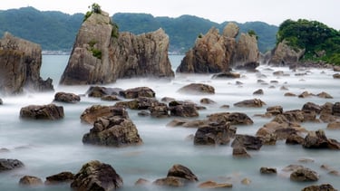 Hashigui-iwa is a group of oddly shaped rocks in Kushimoto-cho, Higashimuro-gun, Wakayama Prefecture, characterized by the beauty of its natural landscape and deeply connected with the Kumano Kodo pilgrimage route and Kumano worship. The 40 to 50 rock pillars of various sizes scattered along the coastline facing the Pacific Ocean resemble a series of bridge piles, hence the name “Hashigake Iwa” (bridge piles). This landscape is designated as a national natural monument, and the harmony of its beautiful appearance and the blue of the ocean attracts many tourists.