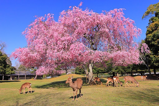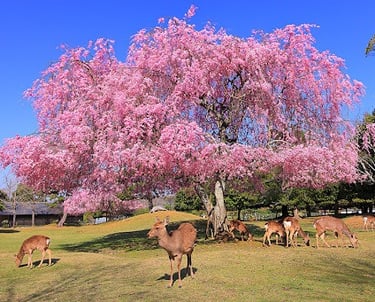 Enjoy the unique scenery created by the cherry blossoms and wild deer. The grounds of Todaiji Temple and Kofukuji Temple are also famous cherry blossom spots.