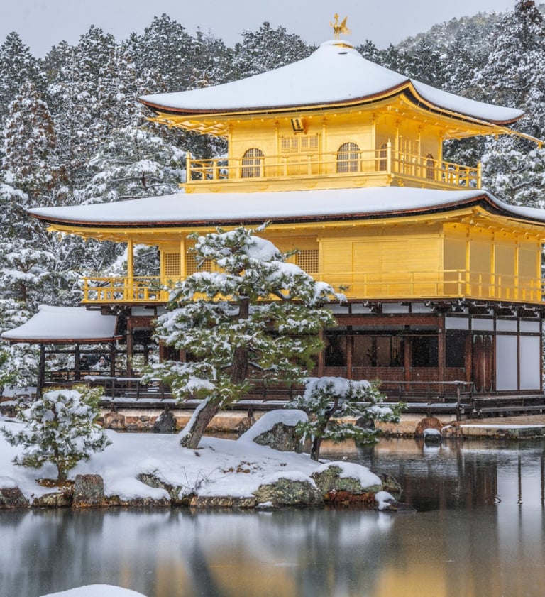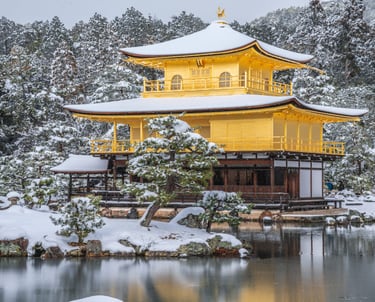 Covered in winter snow, Kinkakuji Temple looks like something out of a fairy tale.