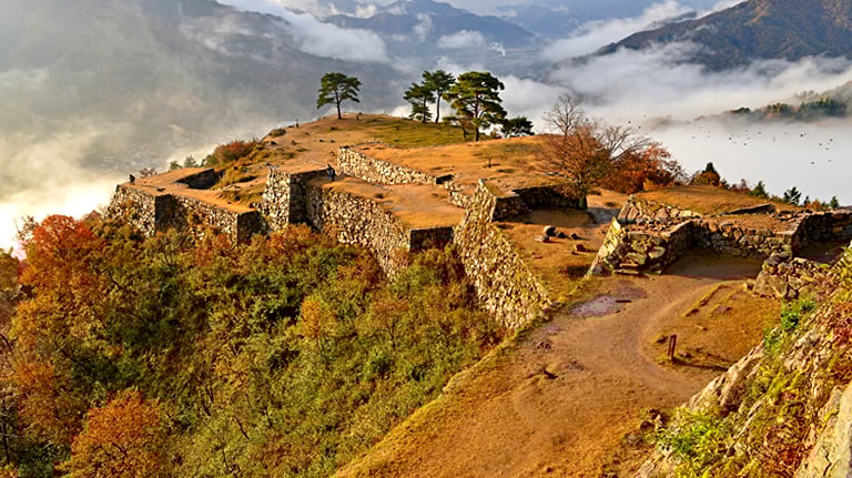 Takeda Castle Ruins is a mountain castle ruins located in Asago City, Hyogo Prefecture, and is a representative tourist attraction in Japan, popularly known as "Castle in the Sky. The sight of the castle floating in a sea of clouds is fantastic and attracts many tourists, especially early in the morning in autumn. It is designated as a national historic site and is one of the 100 best castles in Japan. In 2006, it was named “Japan's Machu Picchu,” attracting attention from both inside and outside Japan.
