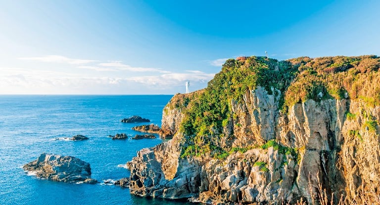 Muroto Misaki, located in the eastern part of Kochi Prefecture in Shikoku, is a scenic natural beauty spot jutting out into the Pacific Ocean. Because of its spectacular scenery and dynamic topography, it has been selected as one of the “50 Best Lighthouses in Japan” and "100 Best White Sand and Green Pines in Japan. The cape faces the Pacific Ocean and is characterized by a landscape of rugged reefs and cliffs. It is a geologically valuable place and was recognized as a UNESCO World Geopark in 2011. It is also known as a sacred site associated with Kobo Daishi (Kukai), including Kongofukuji Temple and Mogosakiji Temple.