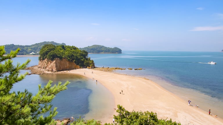 Angel Road is a sandy beach road in Tonosho Town (located in the western part of Shodoshima Island). It is a sand road that appears out of the sea at low tide, connecting small islands. It was named “the road drawn by angels” because of its fantastic scenery. Legend has it that walking hand in hand along this path will make one's wishes come true or bring happiness, and it is said to be especially beneficial for the fulfillment of love and marital bliss.