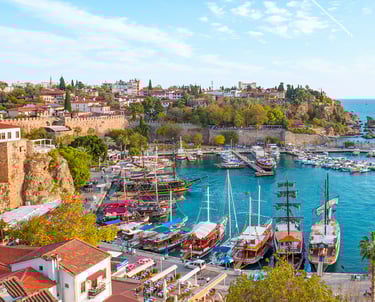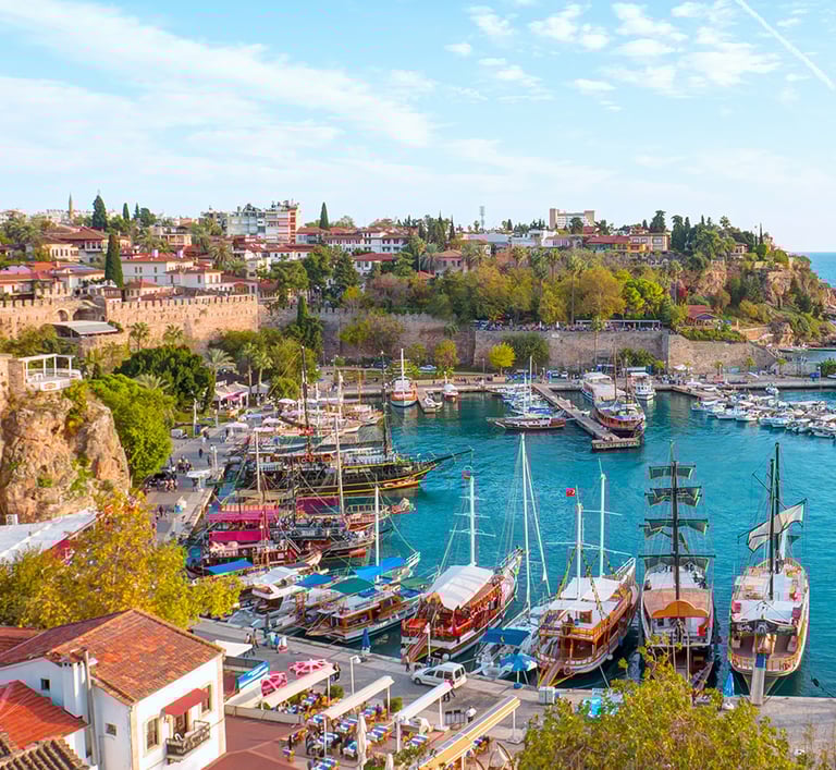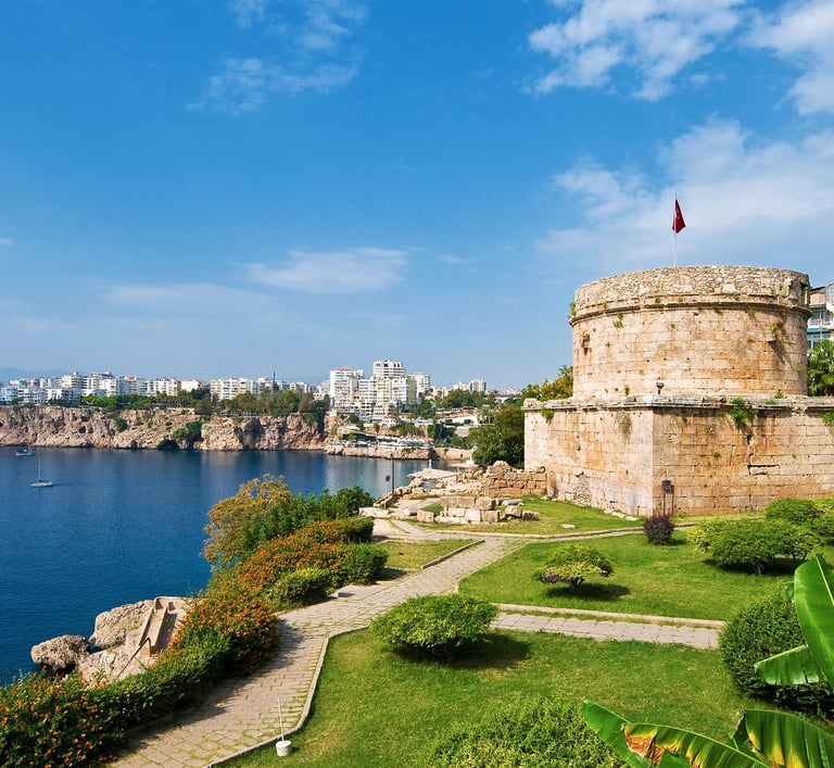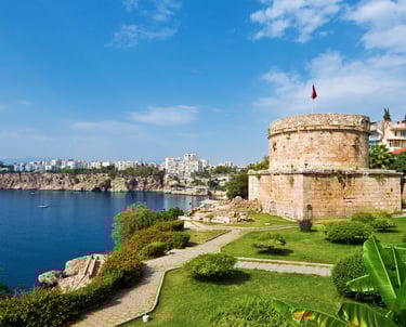 Antalya is a Mediterranean port city located in southwestern Turkey. It is a tourist destination known as the "Treasure Chest of the Mediterranean" with its warm subtropical climate, rich nature, and ancient ruins. Founded in the 2nd century BC by King Attalus II of the Attalid dynasty, the city's name comes from "Antalya" and flourished as a trading hub from ancient times to the Middle Ages.